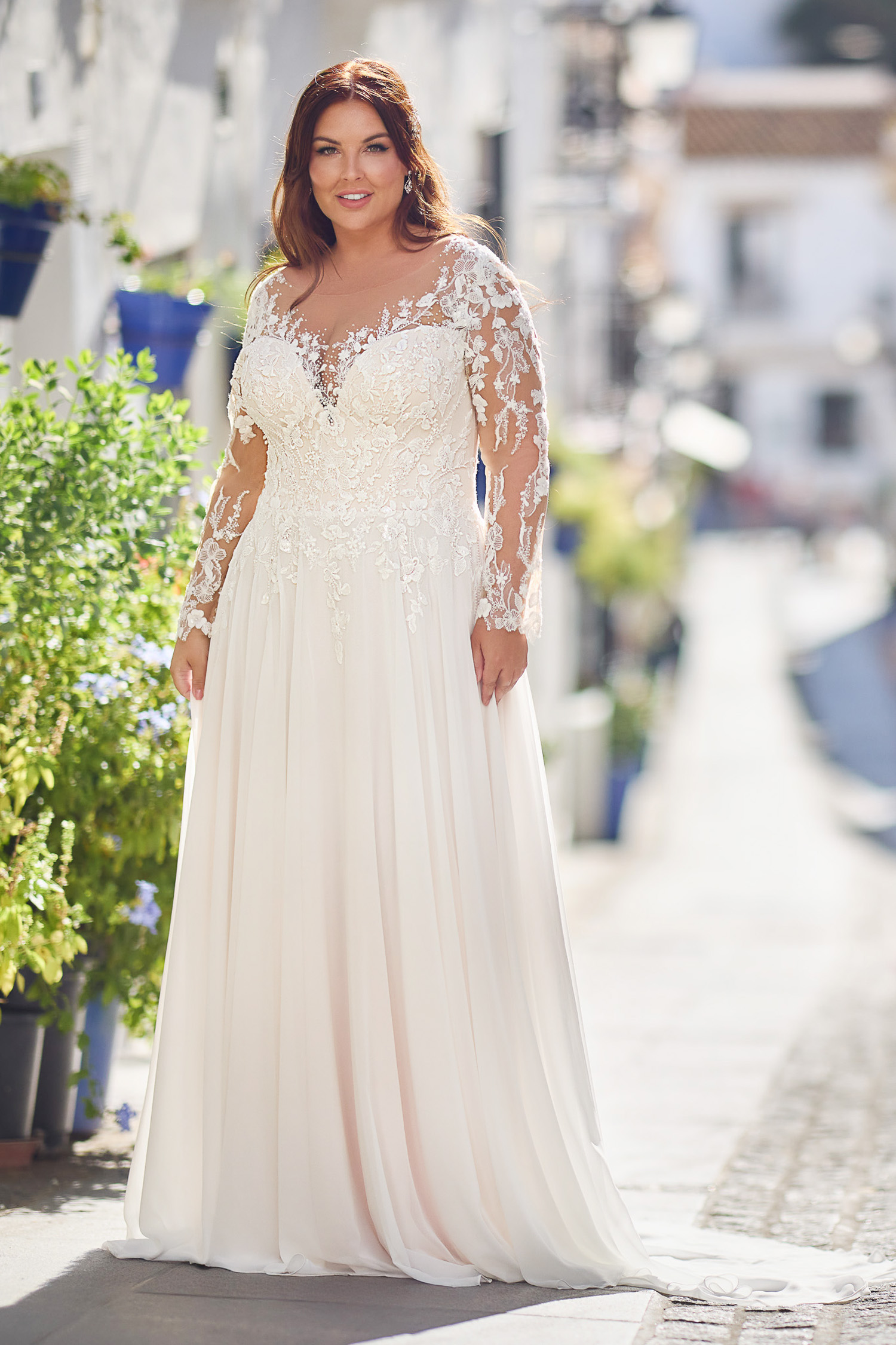 Ein elegantes Brautkleid für große Größen. Das Oberteil ist aus feiner Spitze und der Rock ist aus fließendem Chiffon. Dieses Brautkleid schmeichelt jeder Braut.